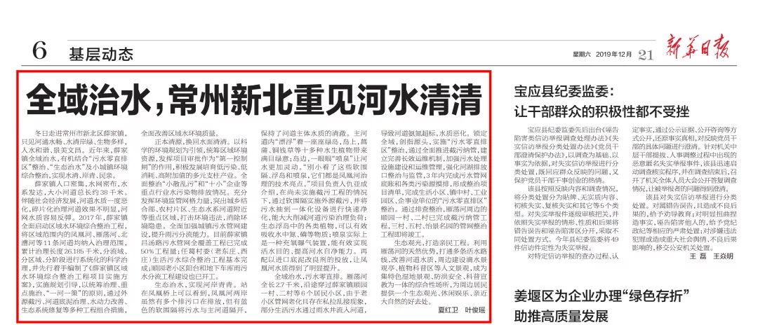 12月21日,新華日?qǐng)?bào)第6版基層動(dòng)態(tài)頭條刊登了《全域治水,常州新北重見河水清清》。據(jù)報(bào)道,在2017年薛家鎮(zhèn)全面啟動(dòng)的區(qū)域水環(huán)境綜合整治工程中,維爾利集團(tuán)水處理團(tuán)隊(duì)負(fù)責(zé)設(shè)計(jì)和施工的薛家鎮(zhèn)鳳凰河水環(huán)境綜合提升工程、雁蕩河南段水環(huán)境綜合提升工程已通過驗(yàn)收。